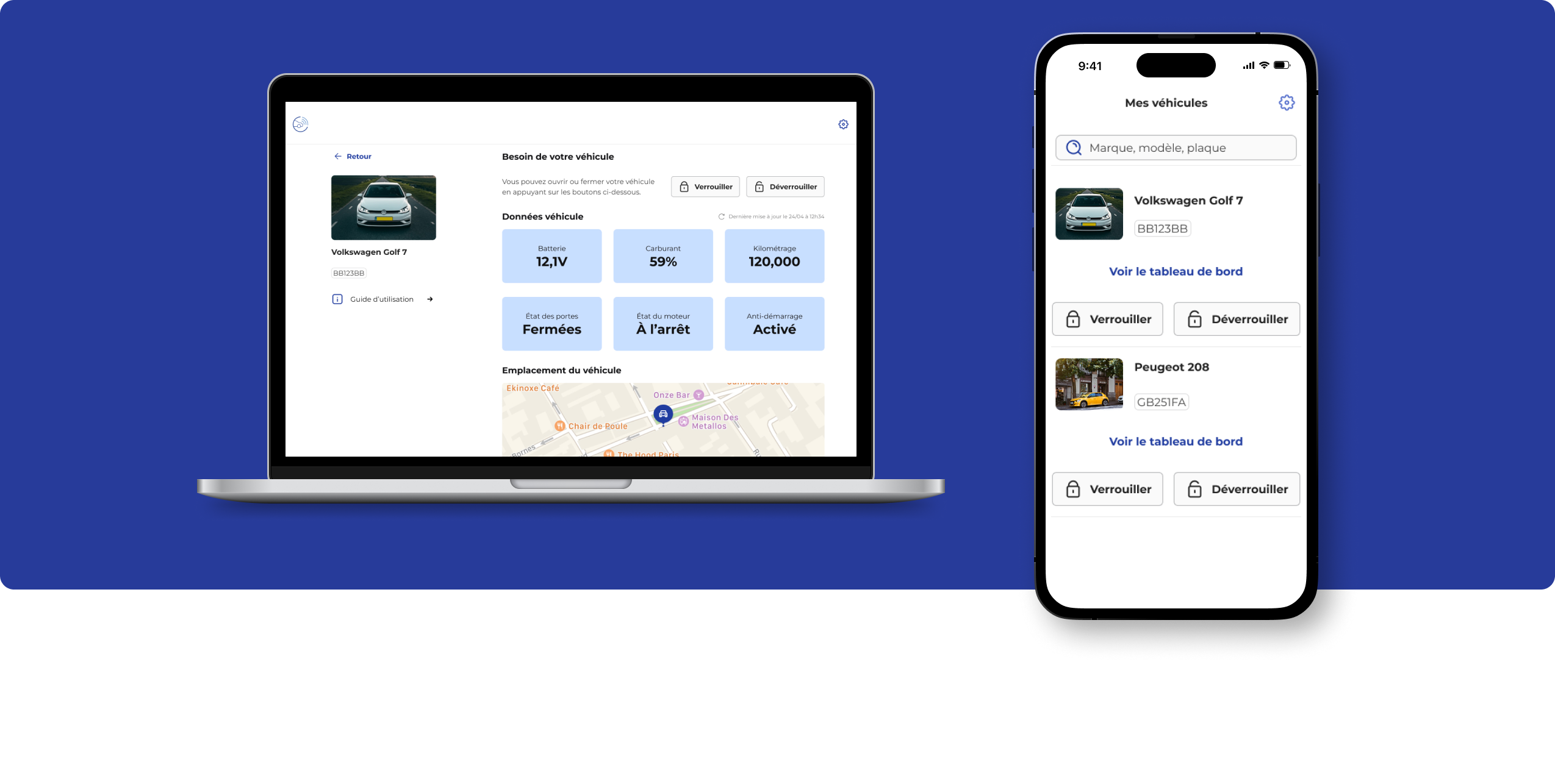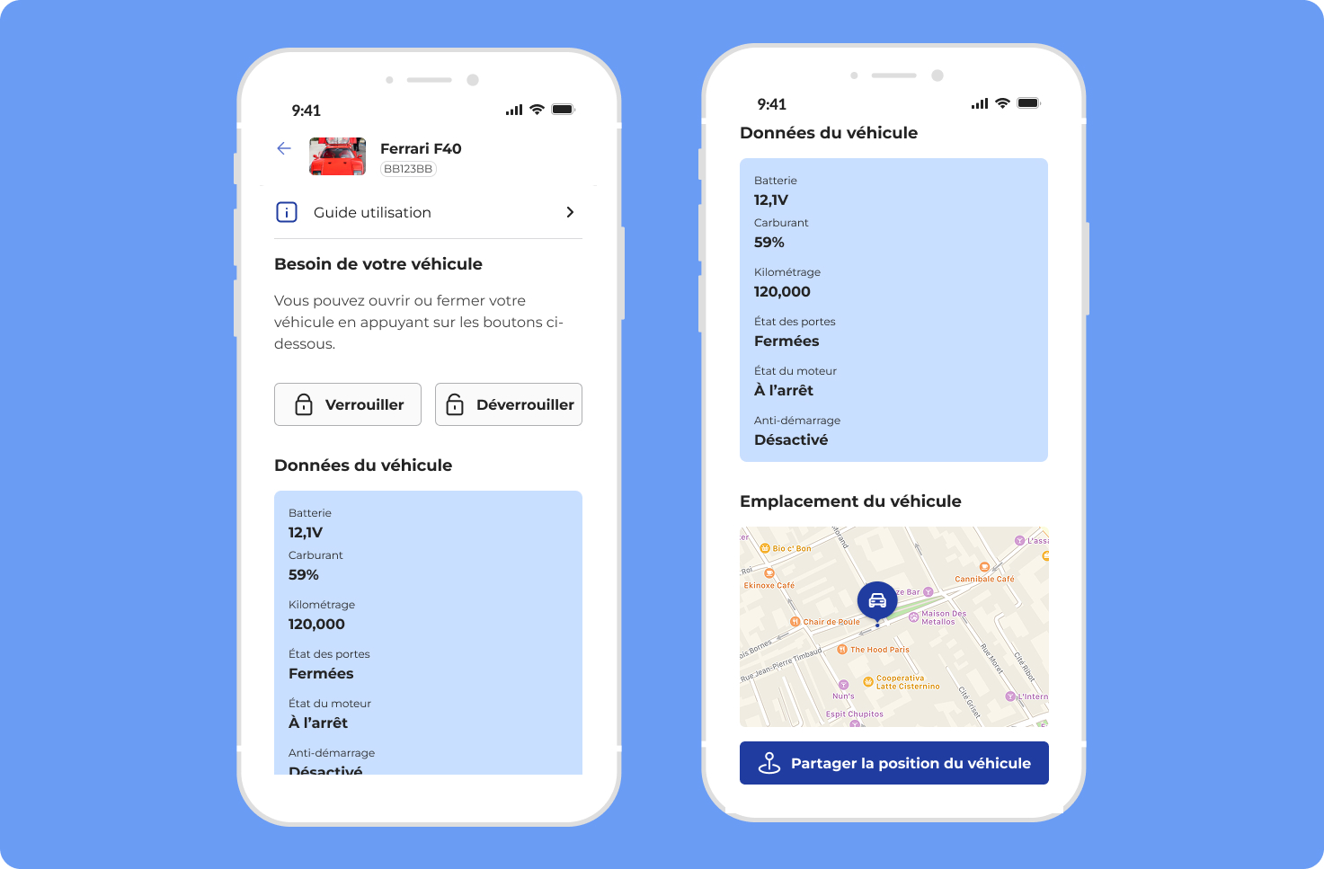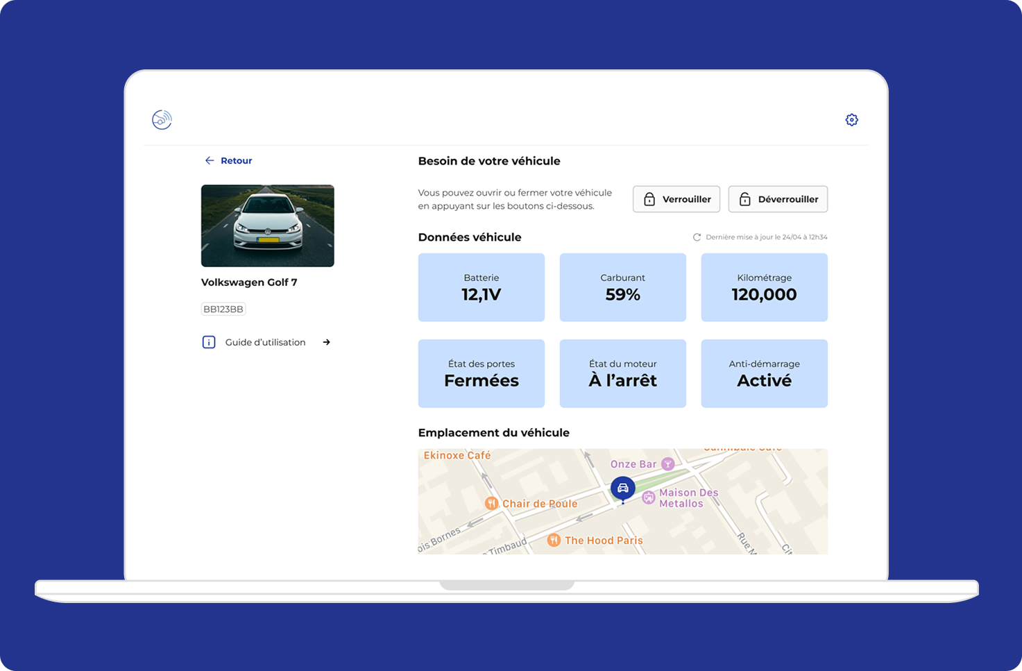 Le propriétaire peut consulter l'état de son véhicule via les informations envoyées par le boitier et visualiser l'emplacement de son véhicule (hors location).