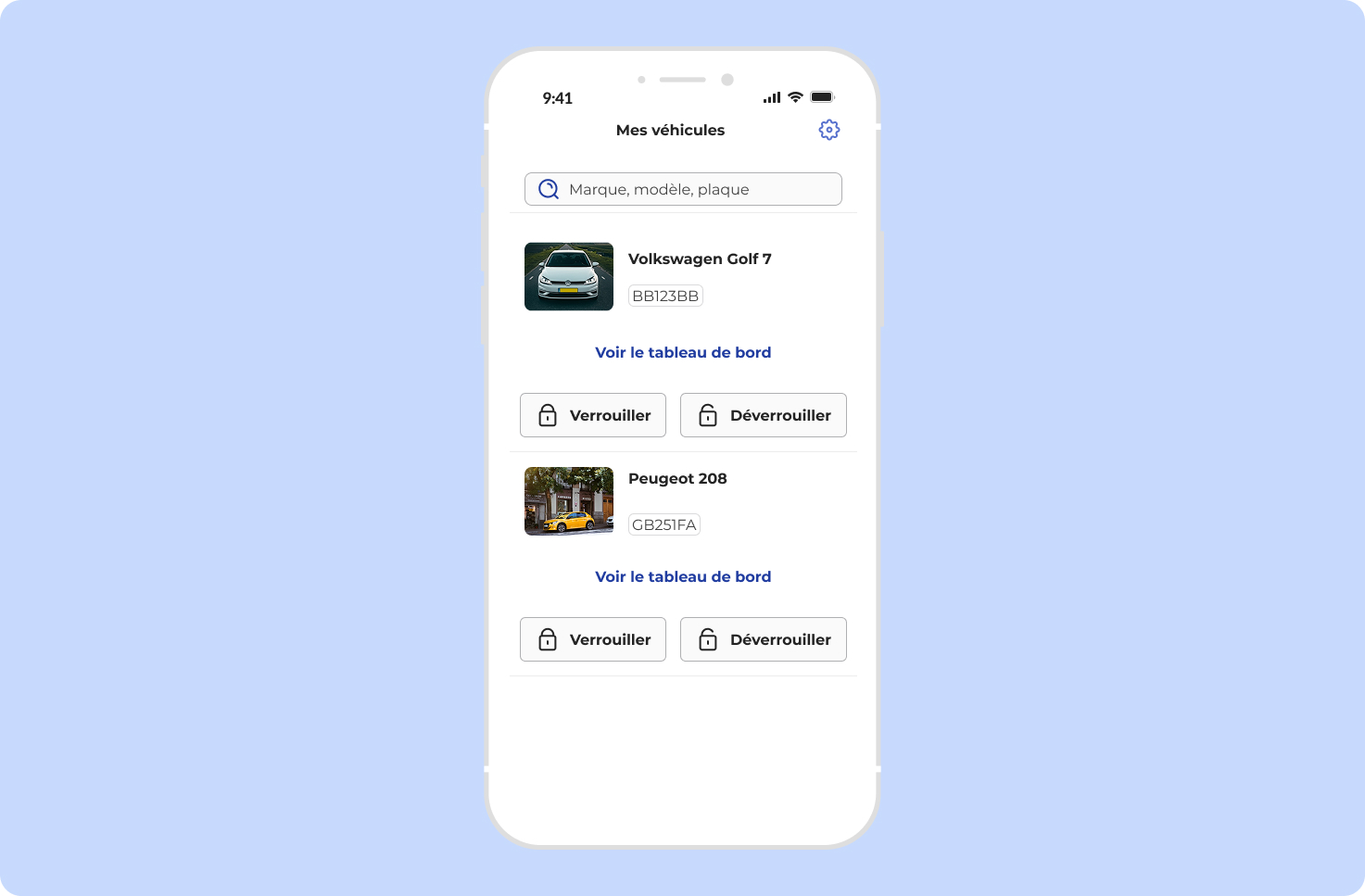Le propriétaire peut retrouver tous ses véhicules possédant un boîtier Connect et interagir avec leur véhicule directement via cet écran.